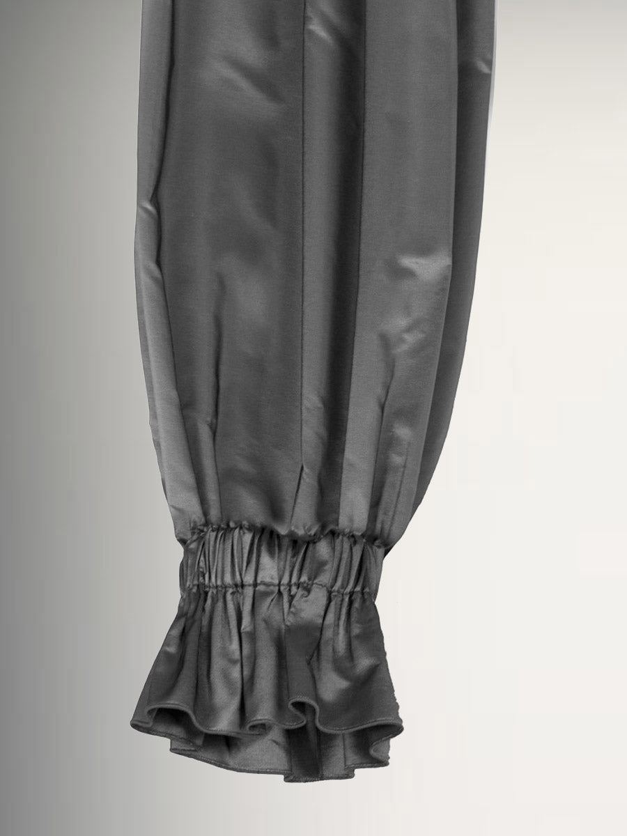 The Zeri metallic effect taffeta sleeve is elasticated at the wrist and top of arm. The fabric is gathered into both ends of sleeves givng a bellow sleeve effect.  Wear with all black sleeveless dress - or marry with the POLA taffeta top for major drama.