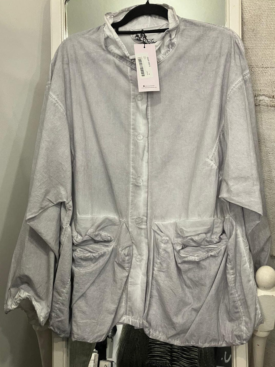 This relaxed fit long sleeved jacket offers style and comfort. With its 'wire in' stand up dog collar; dropped shoulders; together with 'wire in' sleeve edges, you have a unique look. The front opening features large 'invisible' snap fasteners; plus oversized 'letter box' pockets for added swagger.