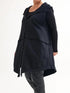 • Hood, finished at high collar closure at neck, with metal popper fastenings down front length